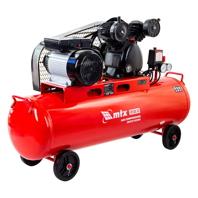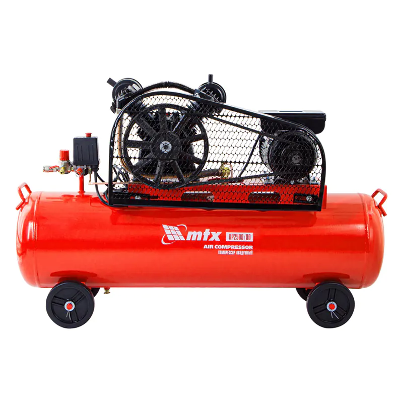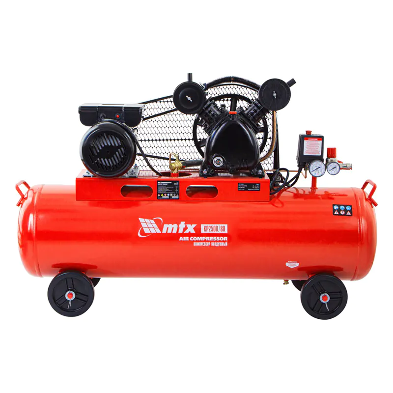 Компрессор воздушный МТХ КР2500/80 с ременным приводом от электродвигателя, мощностью 2,5 кВт и производительностью 420 л/мин, с ресивером объемом 80 литров, применяется для подачи сжатого атмосферного воздуха в пневматические инструменты. К нему можно подключать гайковерт, дрель, степлер, краскопульт, продувочный пистолет и т.п.