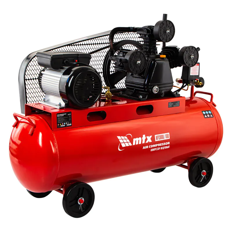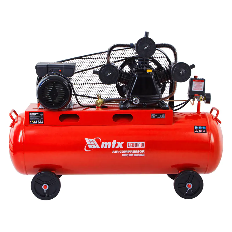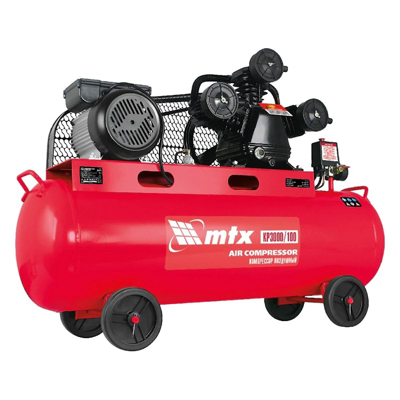 Компрессор MTX КР3000/100 с ременным приводом работает от поршневого двигателя мощностью 3,0 кВт. Корпус изготовлен из металла, окрашенного в красный цвет Инструмент оснащается воздушным баком объемом 100 л с производительностью 510 л/м.