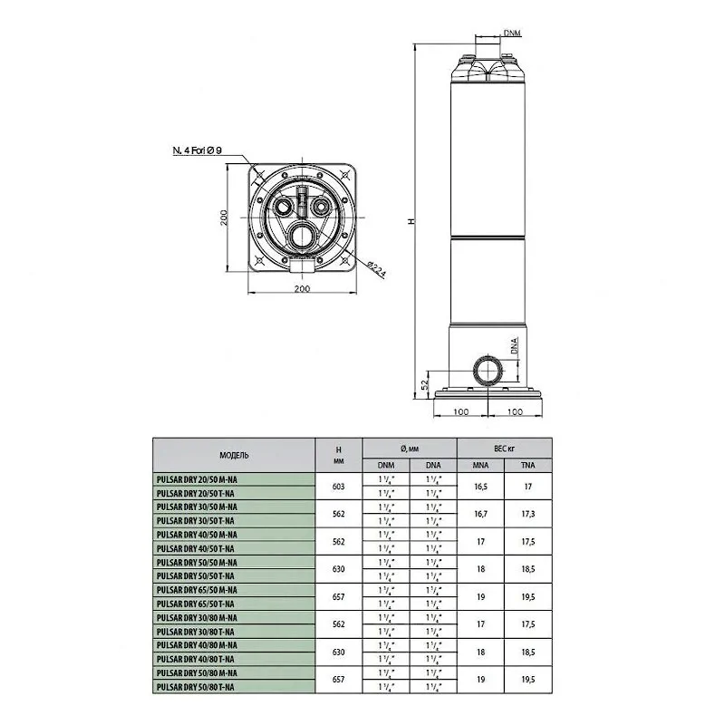 Насос PULSAR DRY 40/80 M-NA разработано специально для индивидуальных и коллективных систем водоснабжения. Рабочий диапазон: производительность – от 0,9 до 7,2 куб.м/ч, напор – до 82 м. водяного столба. Максимальное рабочее давление: максимальная глубина погружения – 20 м. Перекачиваемая жидкость. Состав: чистая, без твердых включений и минеральных масел, не вязкая, химически нейтральная, по характеристикам аналогичная воде. Максимальное содержание песка в воде – 50 г/куб.м. Температура – от 0°С до +40°С. Основные материалы. Рабочие колеса и диффузоры – из технополимера; внешний кожух, кожух двигателя, основание насоса со всасывающим патрубком, вал и крепежные элементы – из нержавеющей стали. Торцевые уплотнения масляной камеры: со стороны гидравлической части – карбид кремния/карбид кремния, со стороны двигателя – графит/керамика. Особенности: Многоступенчатый колодезный насос. Уплотнение вала – масляная камера с двумя торцевыми уплотнениями. Однофазные модели укомплектованы встроенным конденсатором и тепловым выключателем с автоматическим перезапуском. Для трехфазных моделей требуется внешняя защита от перегрузки. Все модели оборудованы всасывающим патрубком. Монтаж. Вал двигателя – в вертикальном положении. Возможен вариант "сухой" установки. При продолжительной работе насос может находиться в не полностью погруженном положении. Комплект поставки: насос в сборе с кабелем 20 м. Стандартное электропитание: 1x230 В, 3x400 В. Степень защиты: IP 68. Класс изоляции: F.