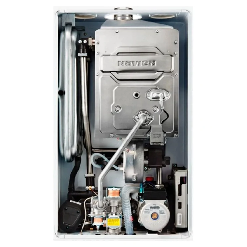 Котел газовый Navien Deluxe S-35K мощностью 35 кВт нагревает воду в ГВС и отапливает помещения площадью до 350 м2. Температура регулируется с помощью пульта дистанционного управления, который поставляется в комплекте.