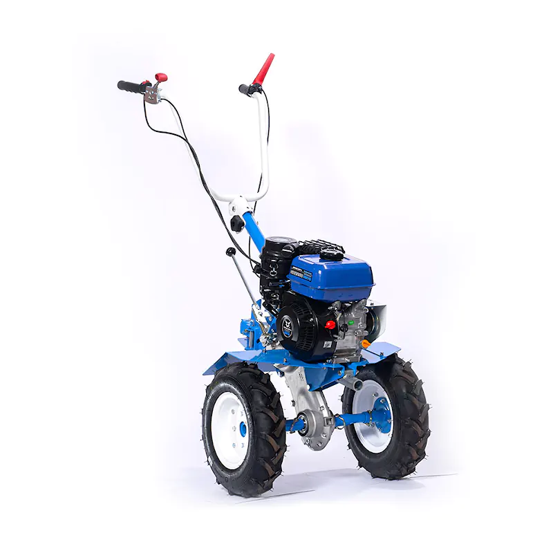 На рукоятках бензинового мотоблока расположены все основные рычаги управления: газа, сцепления и переключения передач. Ограничитель глубины культивации фиксируется на различной высоте в зависимости от типа культивируемой почвы. Задний ход обеспечивает маневренность машины. На первой скорости рекомендуется проводить вспашку целины, на второй — обработку рыхлой и легкой земли.