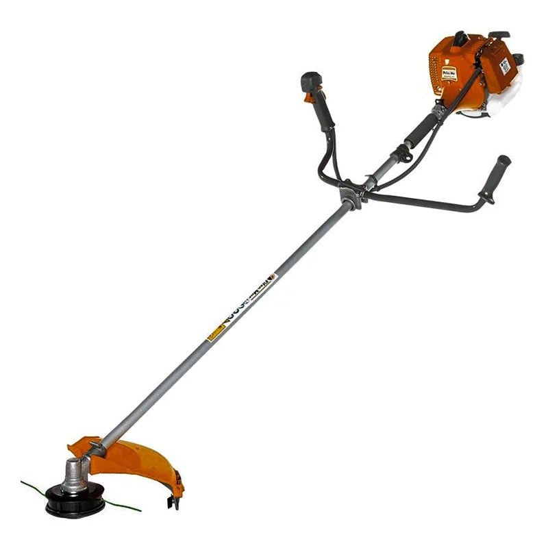 Бензиновый триммер оснащен рукояткой велосипедного типа, которая позволяет совершать размашистые дугообразные движения, обеспечивающие высокую производительность кошения. Длину лески можно увеличить прямо во время работы — для этого достаточно слегка ударить триммерной головкой по земле. Помимо катушки в комплект поставки входит металлический трехлопастной нож для срезания высоких сорняков и поросли кустарников. Система облегченного запуска позволяет оператору прилагать меньше усилий для вытягивания шнура стартера двигателя. Ранцевый ремень с двумя широкими мягкими лямками эффективно снижает нагрузку на оператора.
