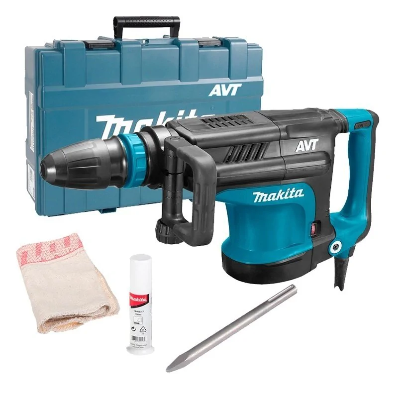 Антивибрационная система AVT состоит из противовеса и амортизаторов. Основная рукоять также закреплена на специальные опоры, которые компенсируют колебания. Такая система снижает вибрации, делая даже продолжительную работу с бетоноломом Makita HM1213C не утомительной.