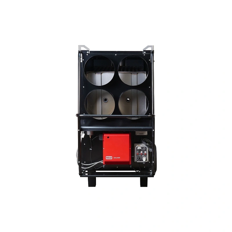 Теплообменник косвенного нагрева с разделением отсеков камеры горения и области прогрева воздушного потока. Для отвода выхлопа горения необходимо смонтировать дымоход, либо допускается уличный монтаж. Система позволяет реализовать как внутренний, так и внешний монтаж с применением рукавов подачи прогретого воздуха. Передняя панель разделена на 4 сопла, для подачи потоков в разные направления, что повышает эффективность и продуктивность технологии.