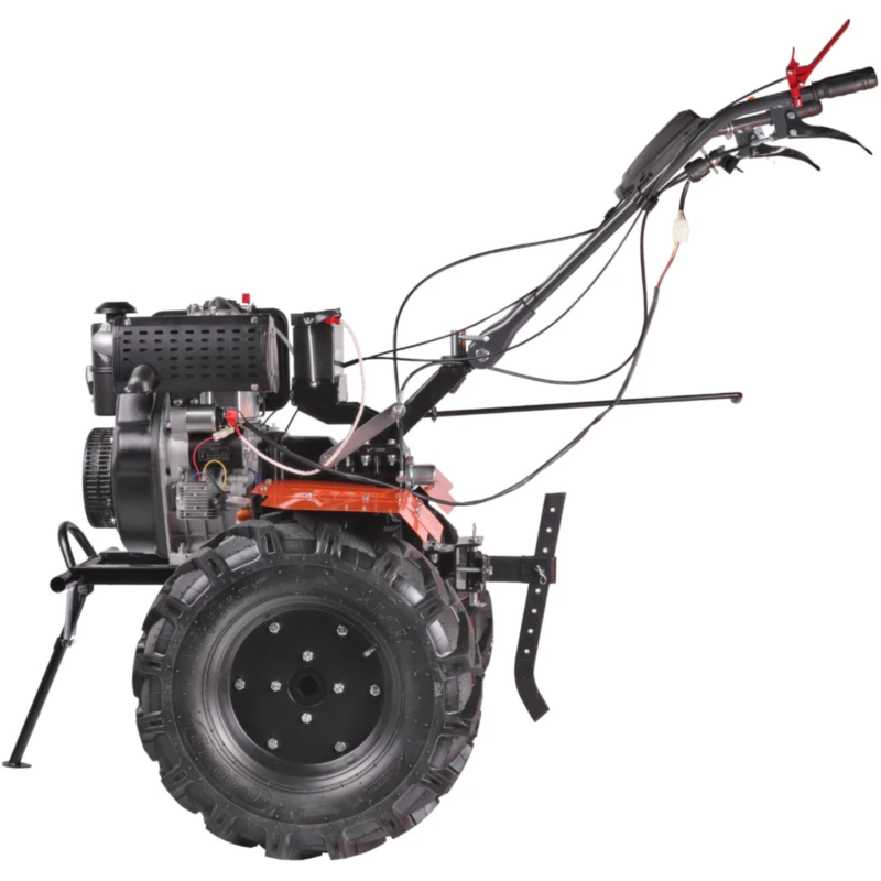 Два вида старта: ручной и электро, с аккумулятором 12В для легкого запуска. Чугунный шестеренчатый редуктор и дисковый механизм сцепления обеспечивают надежность и точность передачи, выдерживая большие нагрузки. Две передачи вперед и одна назад, а также укрепленные металлические фрезы позволяют эффективно работать на тяжелой почве.