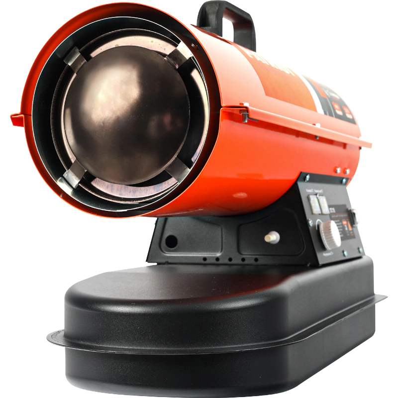 За счет прямого нагрева дизельная тепловая пушка имеет высокий КПД, равный 92 %. При подключении электричества пламя горелки зажигается автоматически. На одном из дисплеев отображается значение текущей температуры окружающей среды, а на другом — установленный с помощью терморегулятора уровень нагрева. Открытое пламя не вырывается наружу благодаря теплоотражающему стальному экрану. Дополнительный защитный кожух не допускает перегревания корпуса.