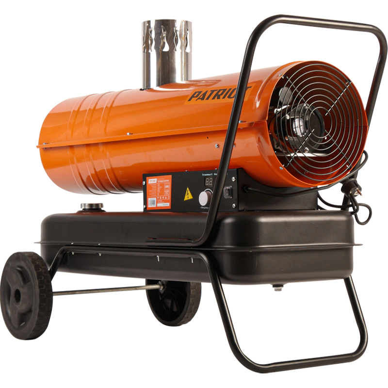 Тепловая дизельная пушка PATRIOT DTC 303i с тепловой мощностью 30 кВт позволяет обогреть помещение объемом до 800 м³. Работает на керосине или дизельном топливе. Для функционирования электроники и вентилятора прибор подключается к электросети 220 В. Теплогенератор непрямого нагрева оснащен трубой для вывода продуктов горения наружу, поэтому может использоваться не только в производственных или складских строениях, но и в местах постоянного пребывания людей. Благодаря экономному расходу горючего 2,5 л/ч одной заправки бака хватает на 22 ч непрерывной работы.
