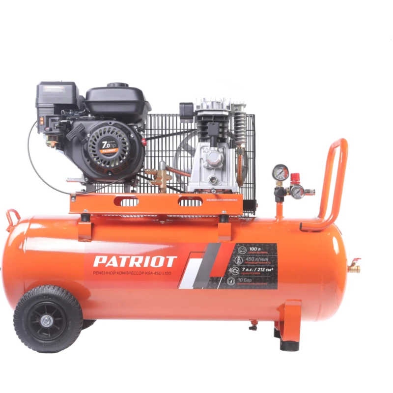 Компрессор воздушный масляный PATRIOT KGA 450 L100 бензиновый поршневой ременной используется там, где нет доступа к электросети. Для мобильных работ с пневмоинструментами и выполнения различных строительных, ремонтных и окрасочных задач. Имеет быстросъемный штуцер (¼") и «елочку» с вентилем.