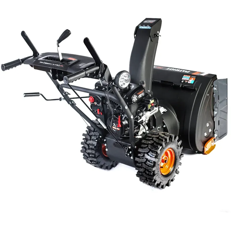 Двигатель бензинового снегоуборщика PATRIOT легко заводится с помощью электростартера. Вдали от розетки 220 В можно воспользоваться ручным стартером. Панель оператора оборудована элементами управления тягой переключения скоростей, приводами колес и шнека. Яркое освещение и подогрев рукояток обеспечивают продолжительную и комфортную работу со снегоочистителем.