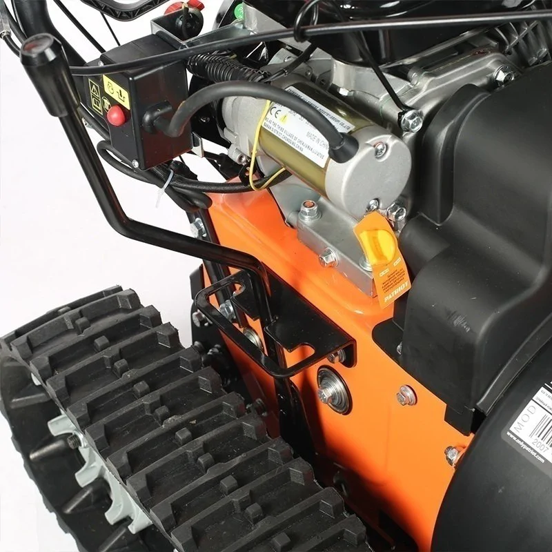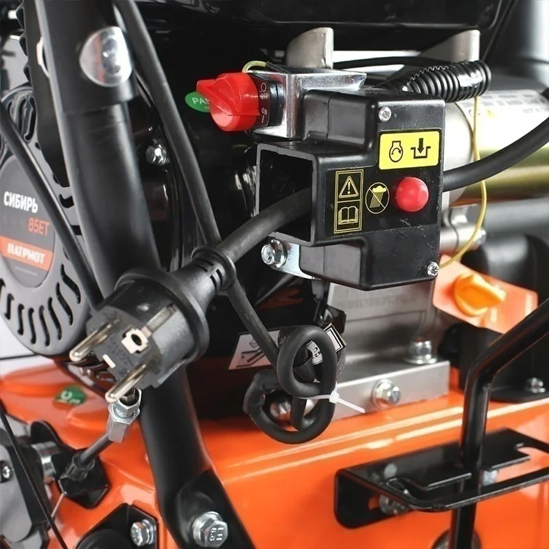 Двигатель самоходного снегоуборщика Patriot Сибирь 85 ЕТ запускается двумя способами, от ручного стартера или электрозапуска. В первом случае понадобится вытягивать тросик, прикладывая усилия. Но такой способ позволит запустить даже холодный двигатель. При использовании электростартера на включение модели у вас уйдет не более 3 с.
