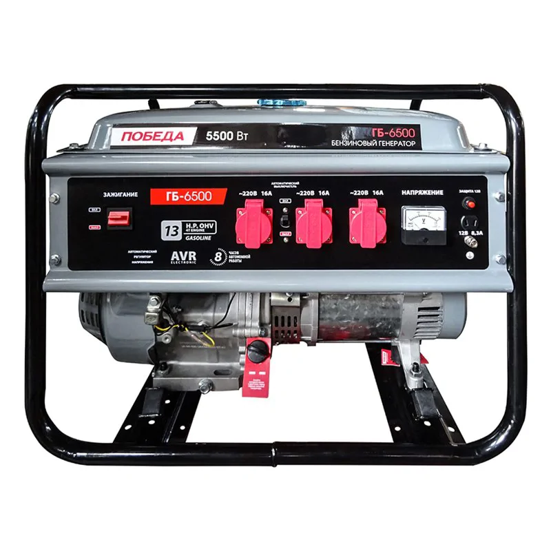Бензиновый генератор ПОБЕДА ГБ 6500 предназначен для питания однофазных потребителей и имеет максимальную мощность в 5,5 кВт. У электростанции есть автоматическая система контроля за выходным напряжением. Это позволяет надежно защитить подключенные потребители от перепадов в сети и от короткого замыкания.