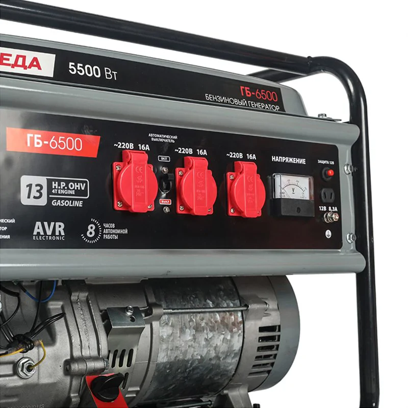 Одновременно к бензогенератору ПОБЕДА ГБ 6500 можно подключить приборы общей мощностью до 5 кВт. Имеется система защиты от перегрузки. В случае перепадов напряжения, или короткого замыкания, электроника не позволит потребителям выйти из строя.