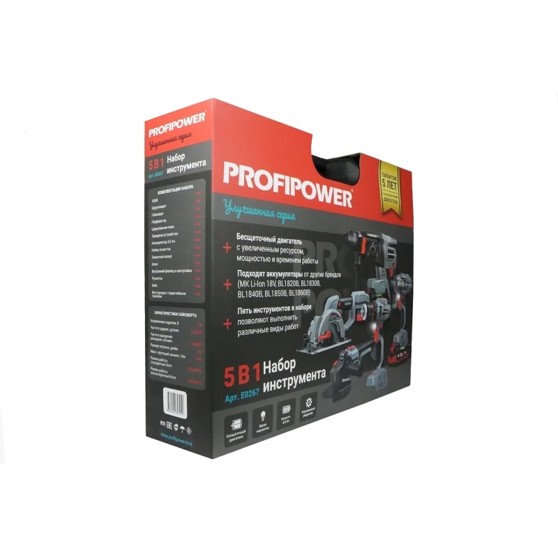 ProfiPower ProfiSet-5F18 аккумуляторный бесщеточный набор 5в1: ушм + шуруповерт + гайковерт + перфоратор + циркулярная пила (3 x 4 Ач, ЗУ) E0267