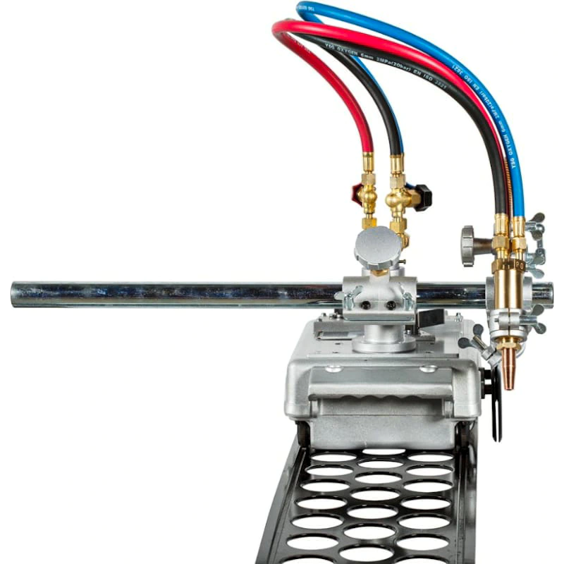 Машина производит раскрой металлических листов методом газокислородной резки, перемещаясь по направляющему рельсу. Это обеспечивает ровный аккуратный разрез без деформаций. Газовый резак установлен в суппорте, который за счет реечных передач перемещает его по вертикали и горизонтали. При необходимости выполнения наклонных резов можно повернуть держатель резака на фиксированный угол 30, 45 или 60 градусов. Установка угла осуществляется по встроенному лимбу, не требуя выполнения замеров.