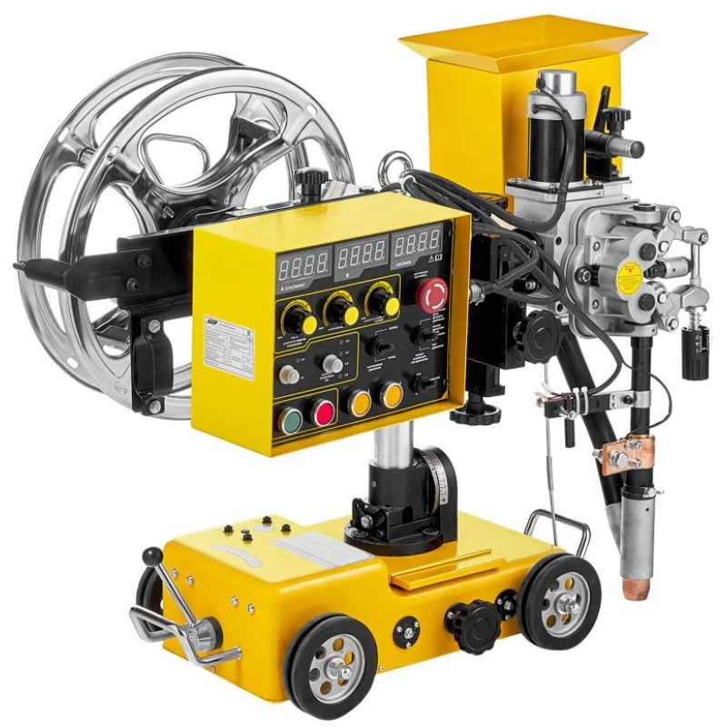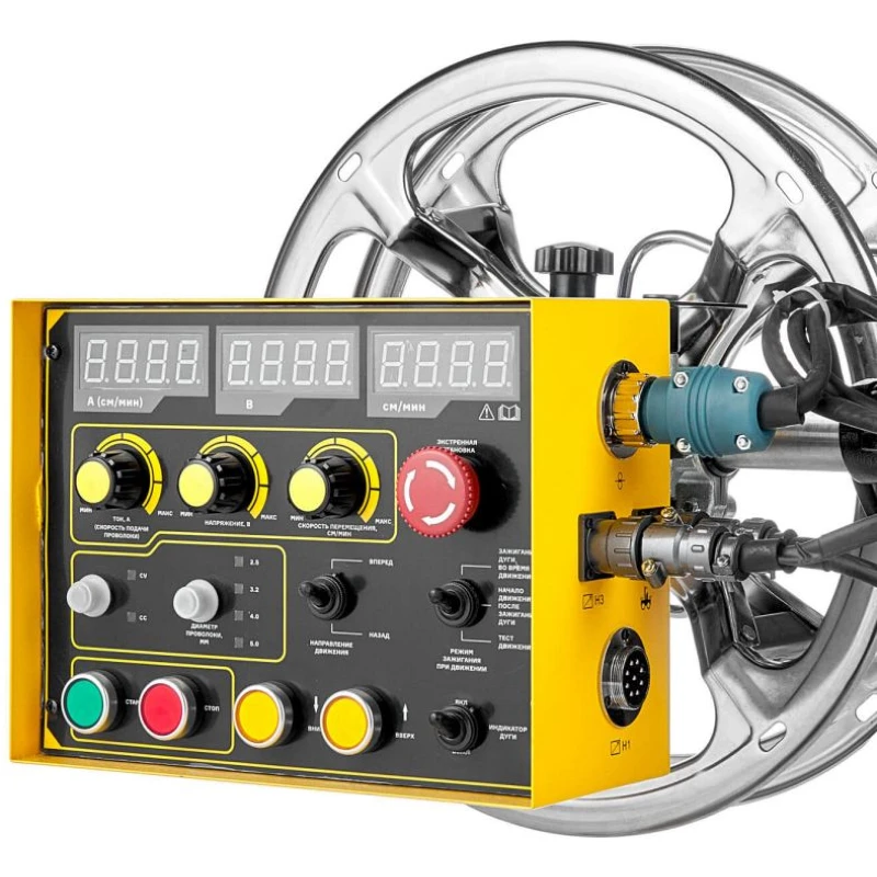Аппарат состоит из инверторного источника питания и сварочного трактора с механизмом подачи проволоки, бункером для флюса и блоком управления. Конструкция предусматривает полный привод колёс каретки — это обеспечивает стабильный ход по ровным и наклонным поверхностям. Оборудование может работать автономно или интегрироваться в автоматизированные производственные линии. Русифицированная панель с цифровыми дисплеями упрощает настройку параметров, а возможность сварки «в лодочку» повышает качество угловых и тавровых соединений, минимизируя образование шлака и облегчая последующую зачистку.