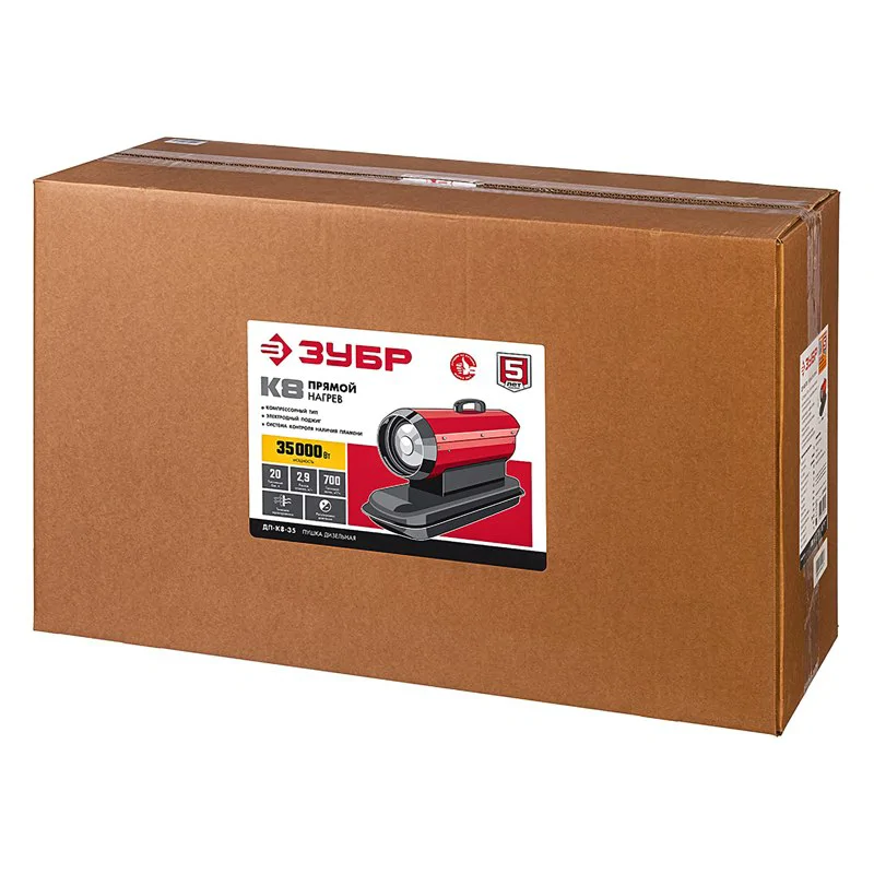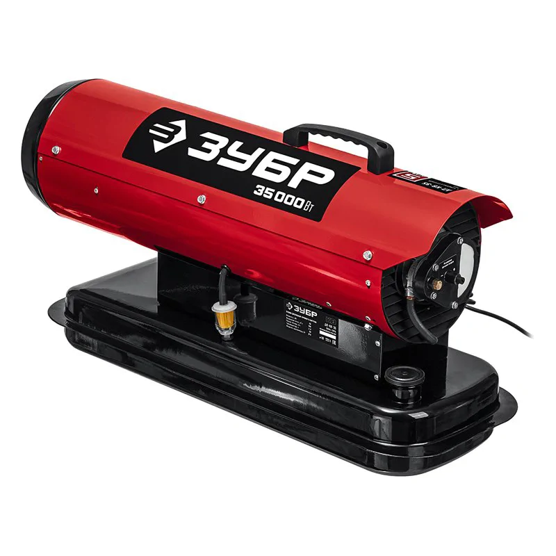 Дизельная пушка ЗУБР ДП-К8-35 прямого нагрева обладает мощностью в 35 кВт и подходит для прогрева или сушки строительных помещений. Для качественного горения предназначена функция контроля наличия пламени, а также датчик уровня топлива, который подскажет о том, когда пора заливать бак соляркой.