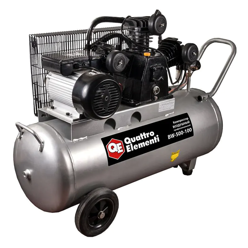 Масляный поршневой компрессор QUATTRO ELEMENTI BW-500-100 с производительностью на входе 490 л/мин, на выходе — 370 л/мин выдает давление до 8 бар. Для продолжительной непрерывной работы модель оборудована большим ресивером емкостью 100 л. Аппарат легко перемещать по рабочему помещению за счет двух транспортировочных колес.