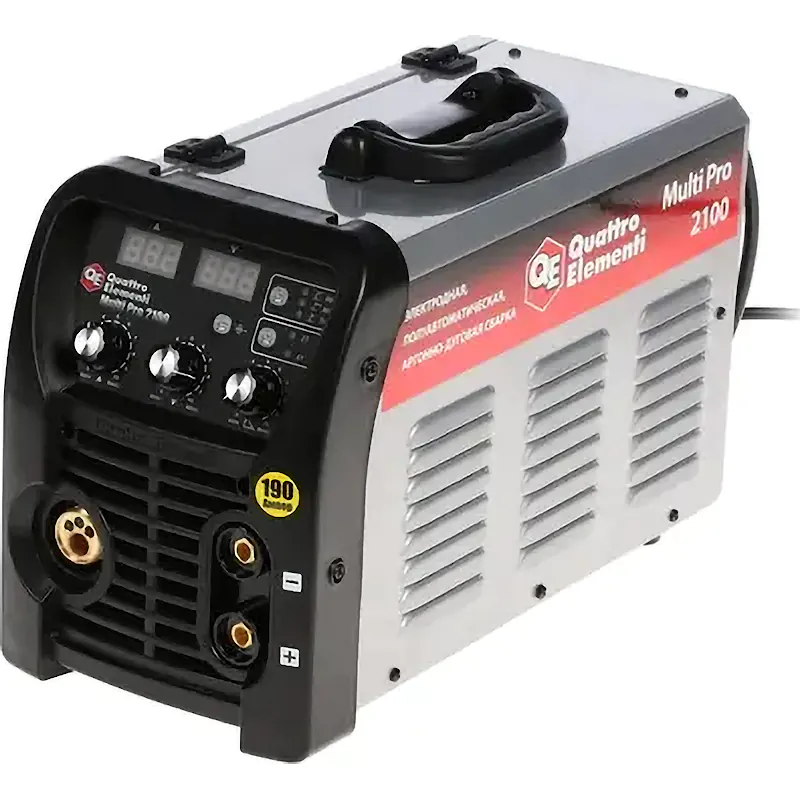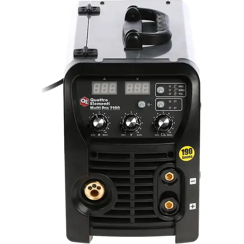 Сварочный полуавтомат QUATTRO ELEMENTI Multi Pro 2100 с диапазоном сварочного тока от 10 до 190 А предназначен для работы в режимах MMA, TIG, а также MIG/MAG. Модель позволяет гибко настраивать параметры сварки, совместима с еврокатушками весом до 5 кг и имеет встроенный механизм для протяжки проволоки.