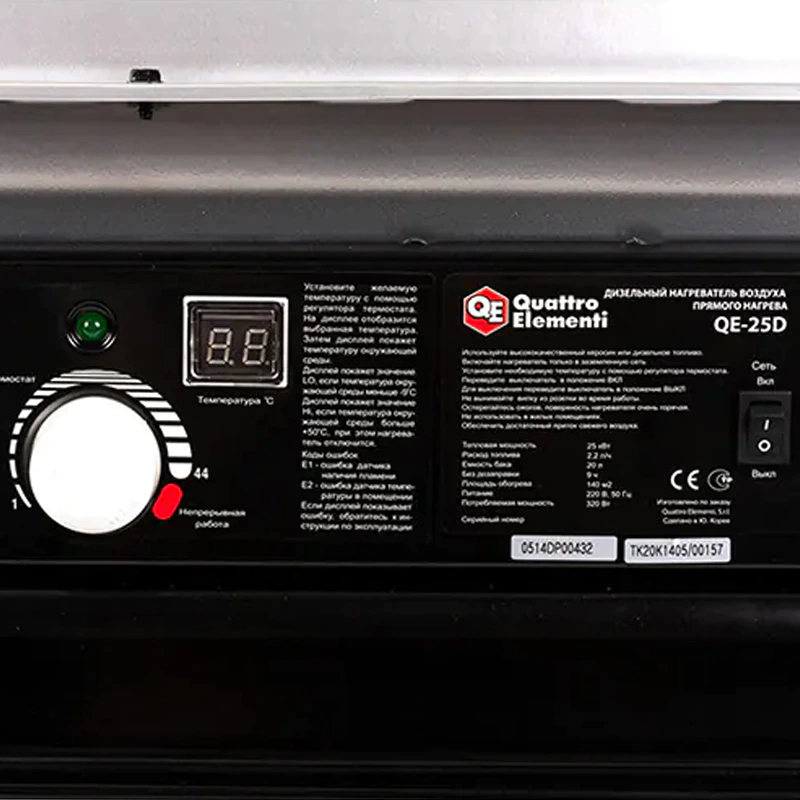 Тепловая пушка Quattro Elementi QE-25D получила табло для отображения текущей температуры. Рядом с ним расположен регулятор. Можно выставить оптимальную температуру, а встроенная электроника будет управлять нагревом.