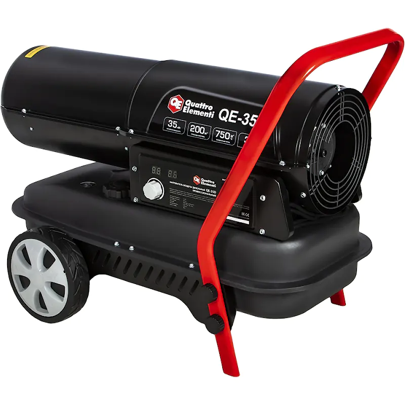 В ее конструкцию встроен высокопроизводительный вентилятор. Он отлично справляется с нагнетанием воздуха. Есть у тепловой пушки Quattro Elementi QE- 35D колеса и ручка для перемещения.