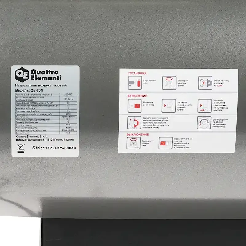Оборудование Quattro Elementi QE-80G дополняется пьезорозжигом и функцией автоматического отключения. Конструкция корпуса дополнена защитой от появления ржавчины и эргономичной рукояткой. Агрегат весит 13.5 кг и поставляется с редуктором и шлангом.