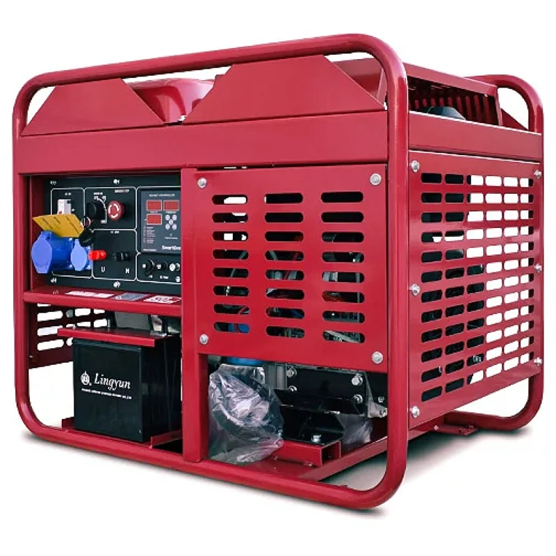 Конструкция: рабочие элементы оборудованы на прочной металлической раме для устойчивости и защиты от воздействий. Предусмотрен трехфазный альтернатор для повышенных нагрузок. Управление производится удобным контроллером с вольтметром.