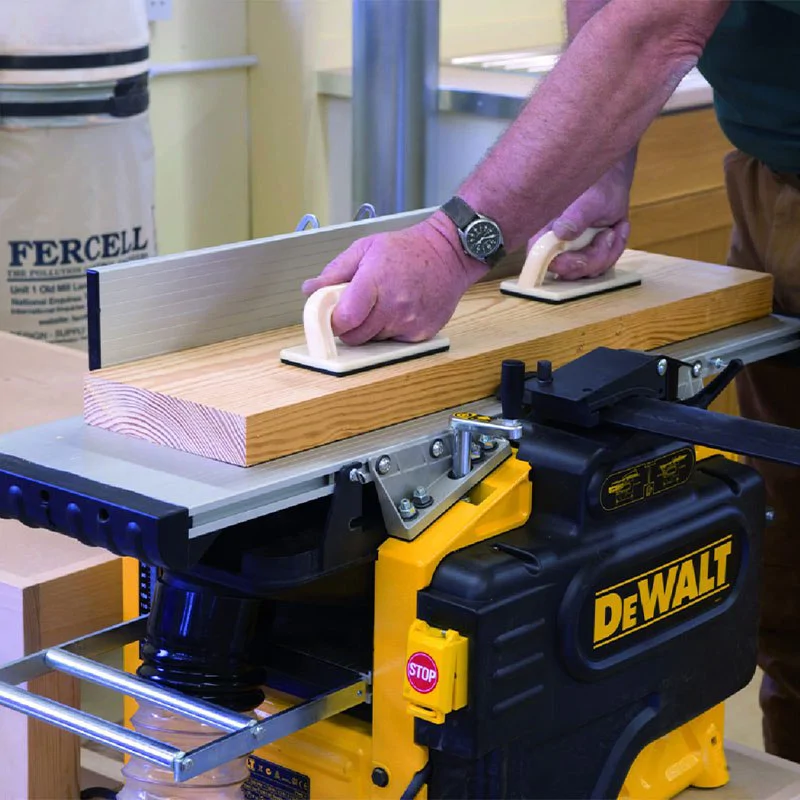 Вал станка DeWALT D27300 оснащен двумя ножами и столами, поэтому работает и как рейсмус, и как рубанок. В режиме рейсмусования вы легко зададите высоту строгания с помощью поворотной рукоятки. Шкала с указателем глубины погружения лезвий и алюминиевый стабильный упор позволяют максимально точно создавать углы в режиме строгания. Максимальная глубина реза в режиме строгания составляет 2,5 мм, в режиме строгания по толщине – 3 мм. Прочная боковая алюминиевая направляющая не дает заготовке уйти в сторону при обработке.
