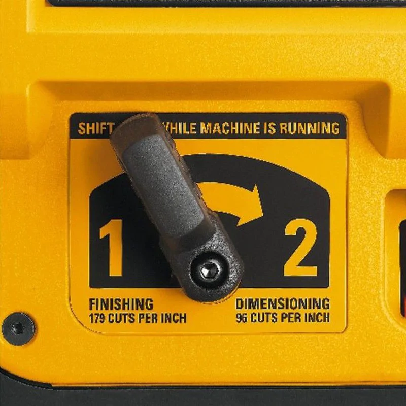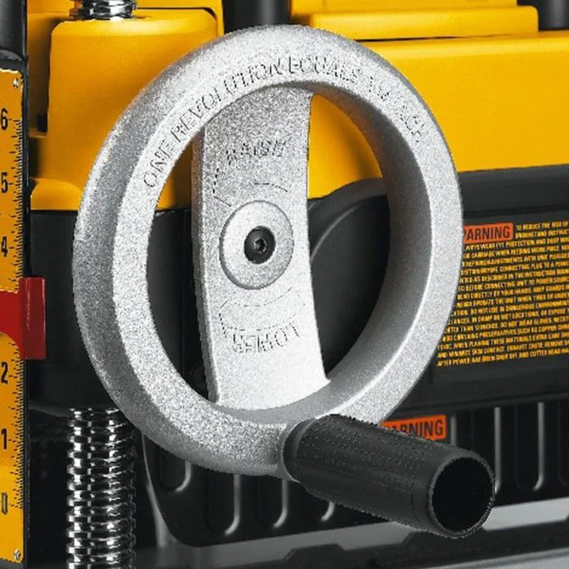 Толщина плавно адаптируется в соответствии с размерами бруска с помощью регулятора на верхней части корпуса. Шкала позволяет точно устанавливать параметр, максимальный составляет 152 мм. Глубина строгания также настраивается до 3 мм — это обеспечивает работу станка DeWalt DW735 с деревом разных пород - твердым или мягким.