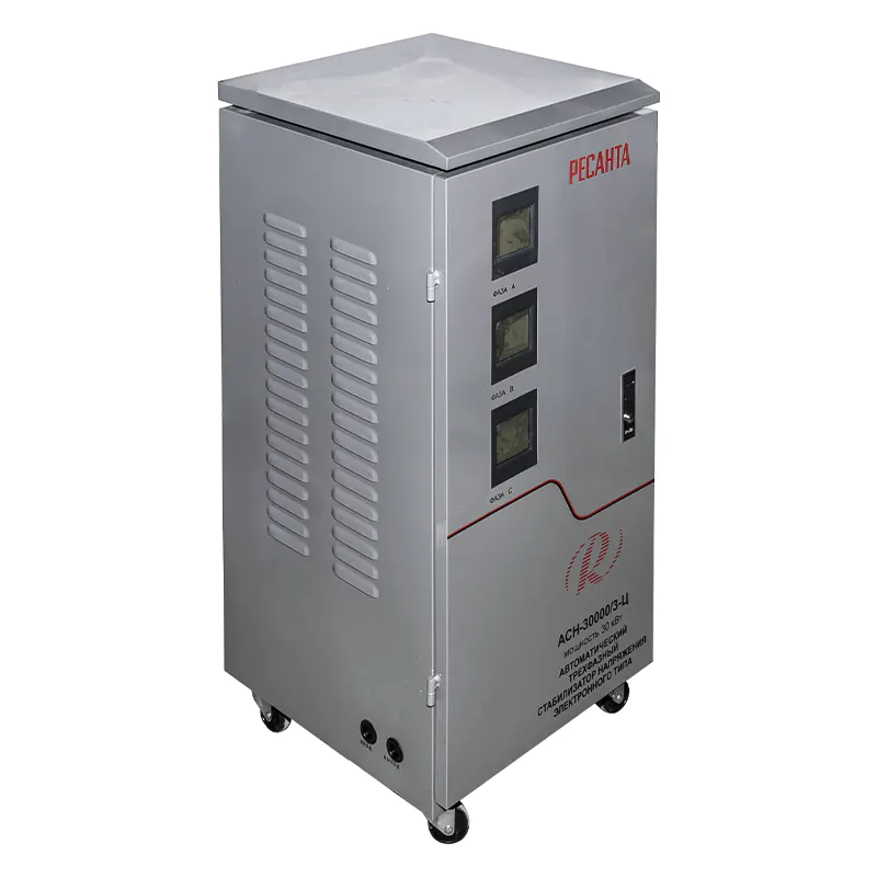 Трехфазный стабилизатор напряжения электронного типа РЕСАНТА АСН-30000/3-Ц изготовлен по релейному типу и работает с оборудованием суммарной мощностью до 30 кВт. Микропроцессорное управление, фильтры помех, индикатор работы и встроенные системы защиты делают эксплуатацию простой и комфортной.
