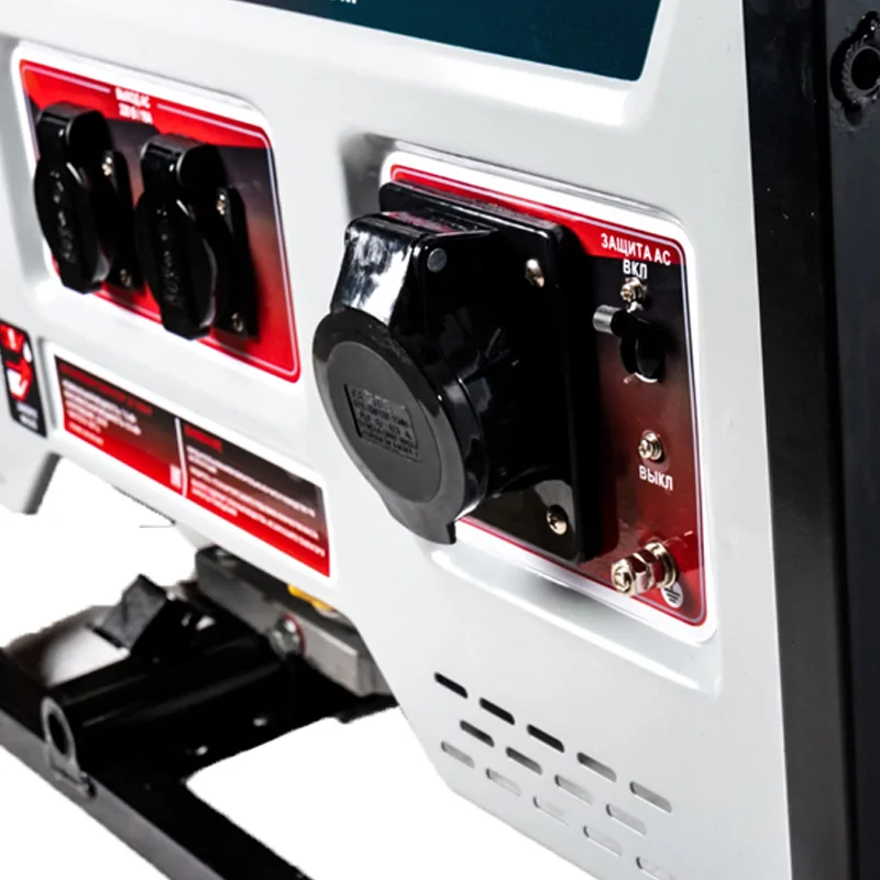 Поршень бензогенератора покрыт керамическим напылением. Благодаря этому исключается преждевременный износ, а также образование нагара при использовании низкокачественного топлива. Корпус оборудован 2 розетками на 16 А и одной на 32 А, которые позволяют подключать различные бытовые приборы.