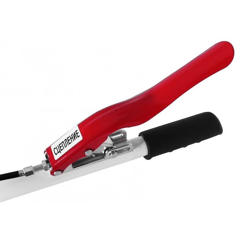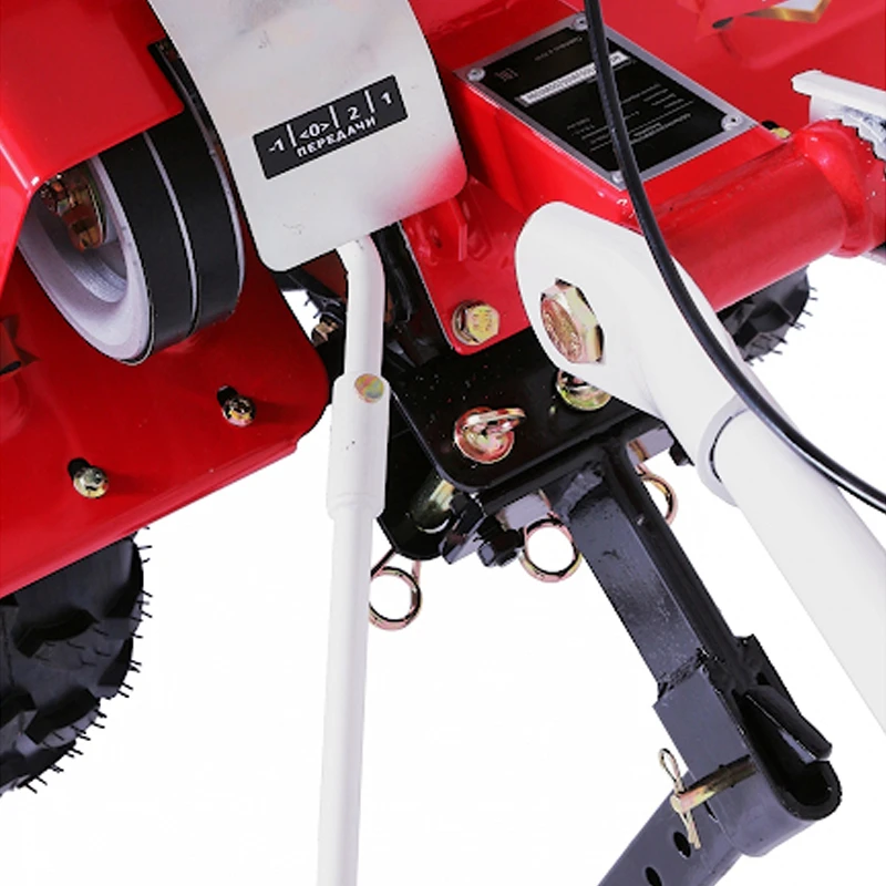 Рулевая рукоятка бензинового мотоблока регулируется по высоте для удобства оператора. На ней находятся такие элементы управления, как ручки сцепления и газа, кнопка включения-выключения. Выключатель зажигания удобно расположен под правой рукой, что позволяет мгновенно заглушить двигатель в экстренной ситуации. Рычаг передач позволяет переключаться между первой и второй скоростью движения вперед, а также включить задний ход, облегчающий вытаскивание застрявшей в земле машины. Глубина вспашки изменяется путем перемещения сошника вверх-вниз, в зависимости от условий обработки и типа почвы.