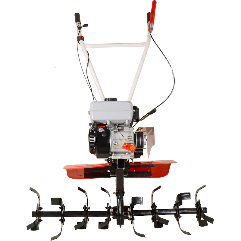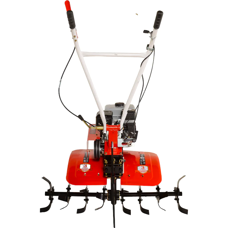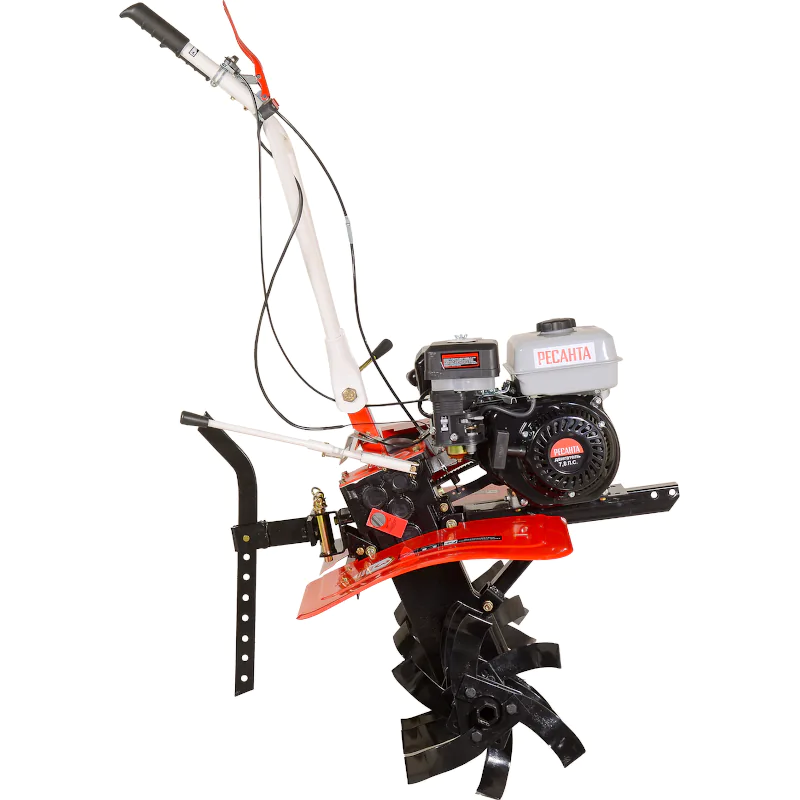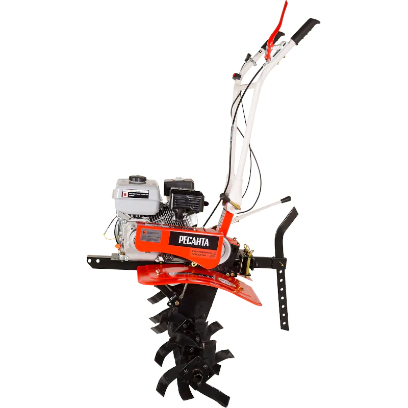 Пониженная передача специально предназначена для обработки тяжелой почвы и работы с навесным оборудованием. Переключение на задний ход значительно повышает маневренность машины и облегчает ее вытаскивание в случае увязывания в сырой земле. Элементы управления вынесены на рулевую рукоятку бензинового мотоблока для удобства контролирования работы машины. Электронный выключатель зажигания позволяет мгновенно заглушить двигатель в экстренной ситуации. Сошник имеет несколько отверстий для гибкой регулировки глубины вспашки в зависимости от типа и состояния почвы.