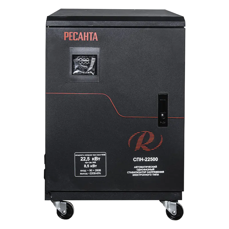 Стабилизатор напряжения РЕСАНТА СПН-22500 используется для выравнивания входного напряжения и защиты подключаемых приборов от перепадов электричества. Минимальное значение тока составляет 90 В, благодаря чему устройство подходит для мест с некачественной сетью и нестабильными источниками энергии.
