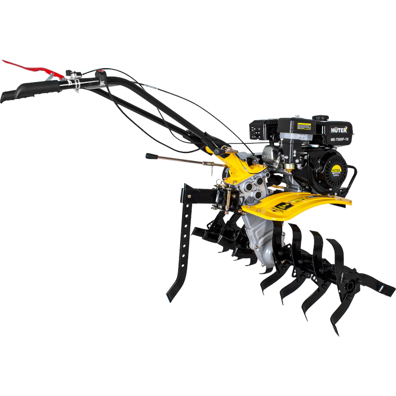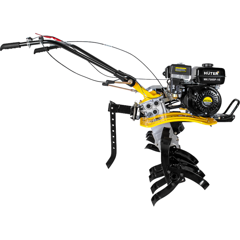 Сельскохозяйственная машина HUTER МК-7000Р-10 поставляется с большими колесами, диаметр которых составляет 10 см. Благодаря этому устройство не будет проваливаться в рыхлый грунт.