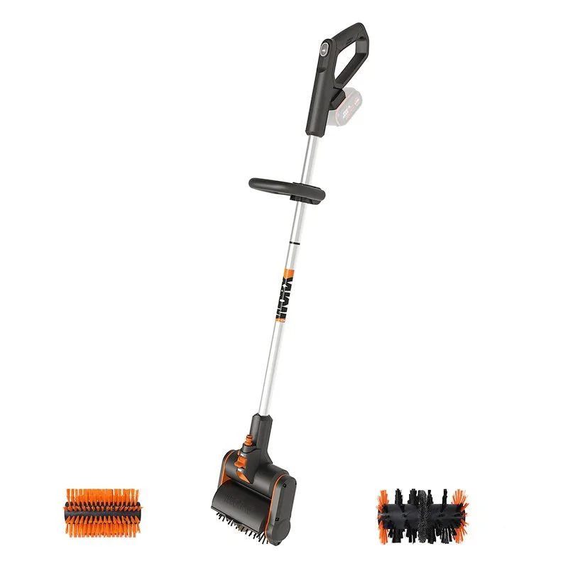 Щетка для чистки дорожек WORX WG441E отличается удобством использования и высокой производительностью. Насадка с жесткой щетиной вращается с частотой до 900 об/мин и легко удаляет с каменной или асфальтовой поверхности мох, грязь или сорняки. К щетке можно подсоединить садовый шланг. Вода подается под давлением 0,6 МПа, что значительно повышает скорость и качество уборки. Электровеник работает от универсального Li-Ion аккумулятора 20 В емкостью 4 Ач, совместимого с другими аккумуляторными устройствами производителя.
