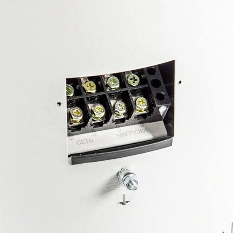 Абсолютная бесшумность в работе однофазного стабилизатора напряжения, а также охлаждение конвекционного типа достигаются за счет особой конструкции корпуса. Если возникнет угроза перегрева, то сработает многоуровневая система защиты. Она включает в себя датчики температуры и защитное реле, которые отслеживают состояние стабилизатора. При перегреве произойдет автоматическая остановка. В качестве дополнительной защиты в стабилизаторе есть автоматический выключатель.