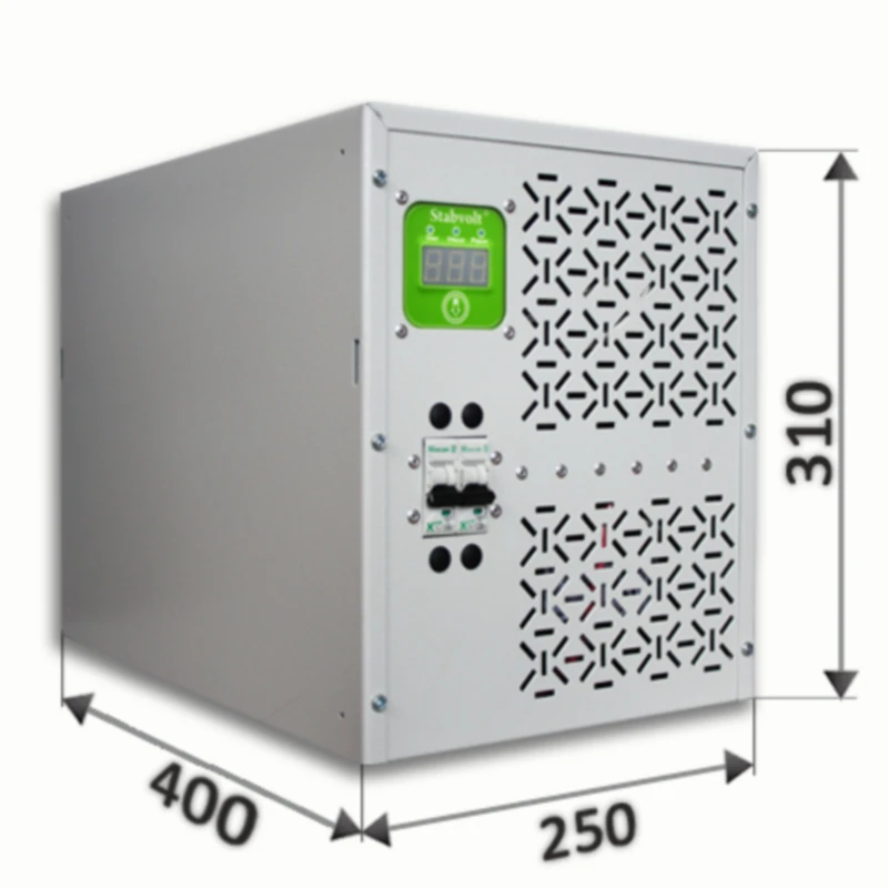 Для защиты внутренних цепей применяется широкий спектр методов, в том числе программно-аппаратный, а также система защиты от перегрева трансформаторов и активная система принудительного охлаждения (при достижении пороговой температуры на измерительных датчиках). Для отображения значения входного и выходного напряжения, а также потребляемой мощности в кВт, используется 3-х разрядный индикатор с выбором режима отображения. Применяемый компактный корпус из нержавеющей стали с порошковой окраской RAL 7035 позволяет использовать это оборудование в качестве элемента интерьера. Также есть возможность закрепить стабилизатор на стену посредством монтажной планки крепления.