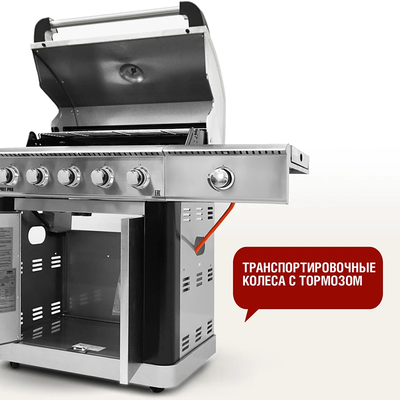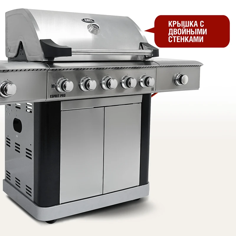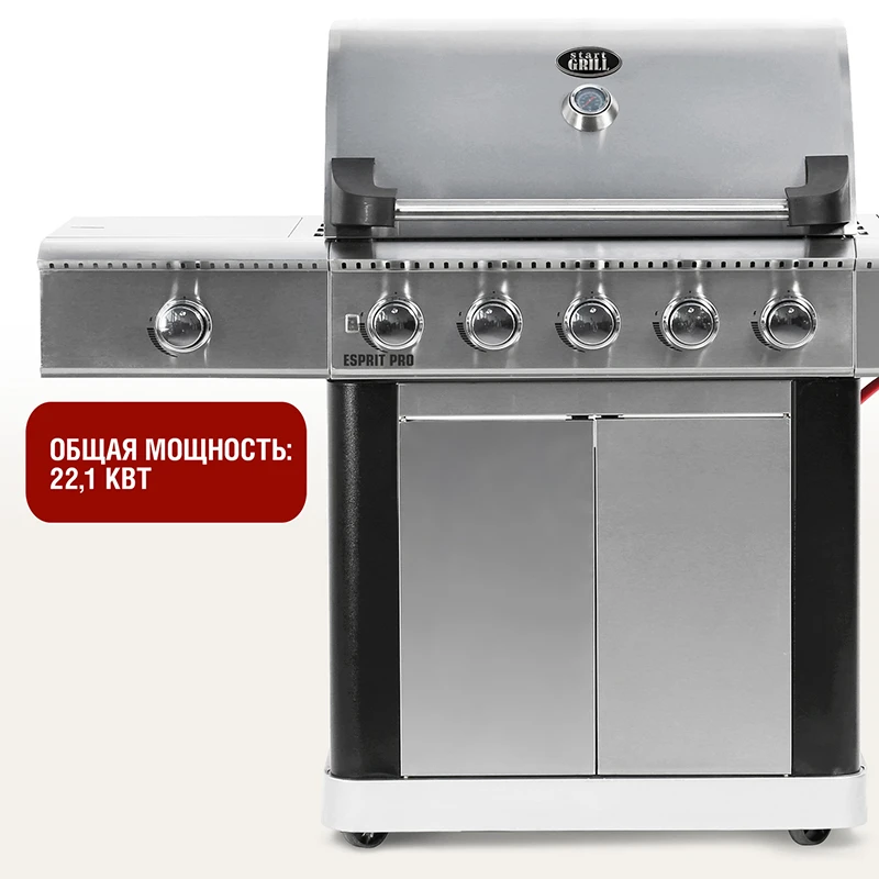 Ярким преимуществом модели Esprit Pro является наличие 5 горелок, которые обеспечивают равномерное распределение тепла. Инфракрасная ветроустойчивая левая боковая горелка разогревается до 800°C и гарантирует идеальную прожарку мяса в любую погоду. Правая мощная боковая горелка прекрасно подойдет для приготовления фирменных соусов. Гриль укомплектован чугунными решетками для приготовления, чугунной планчей и решеткой для подогрева.