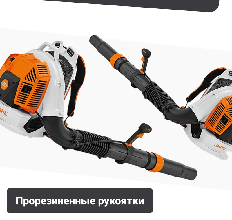 Прорезиненные рукоятки гасят колебания, идущие от двигателя. Система не нарушает кровообращение рук при использовании, благодаря чему снижается нагрузка и обеспечивается стабильная работа. Это позволяет проводить уборку длительное время без усталости.