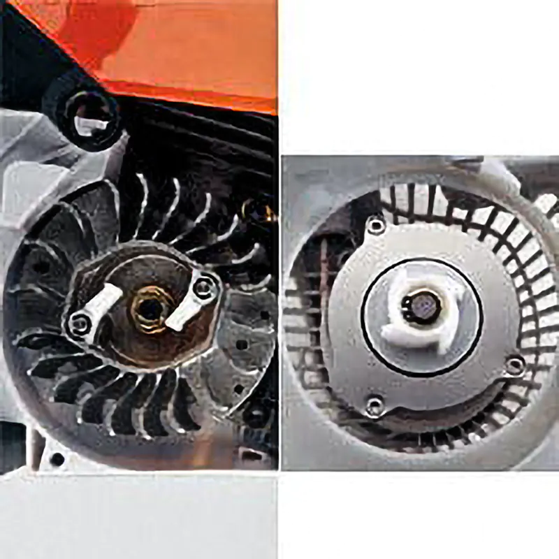 Бензокоса обладает системой ErgoStart, которая обеспечивает быстрый запуск двигателя. Дополнительная спиральная пружина компенсирует силовые потоки, которые возникают при включении мотора. Это обеспечивает плавный старт без больших усилий — оператору достаточно равномерно потянуть за шнур.