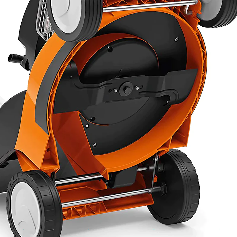 Инструмент оснащен нож с закрылками. Это создает мощный поток воздуха, который приподнимает траву в процессе скашивания, что делает конечный результат аккуратнее. Высоту стрижки можно выставлять при помощи рукоятки на середине корпуса. Рычаг переключается в любое из 5 положений, позволяя установить ножи Stihl RME 443 в диапазоне от 25 до 65 мм от поверхности. Выбор делается в зависимости от состояния участка и требования к газону.