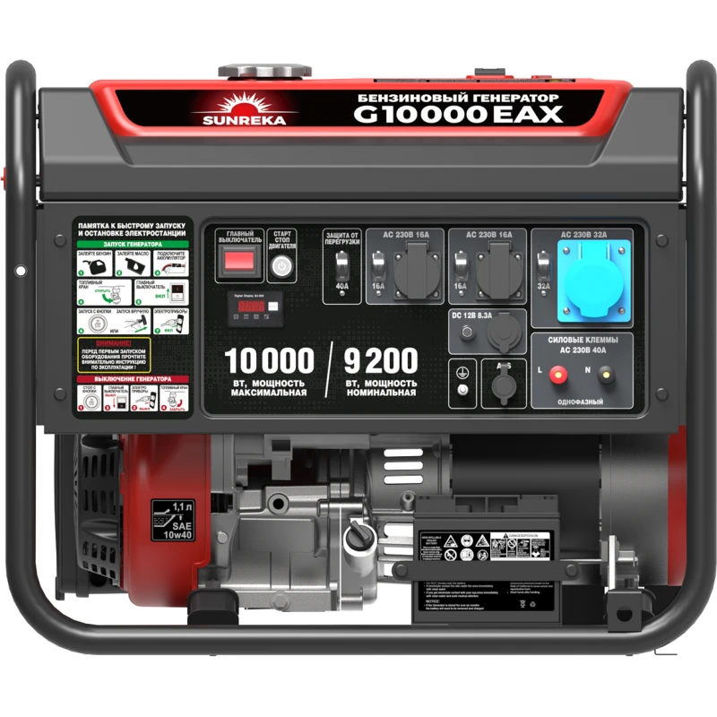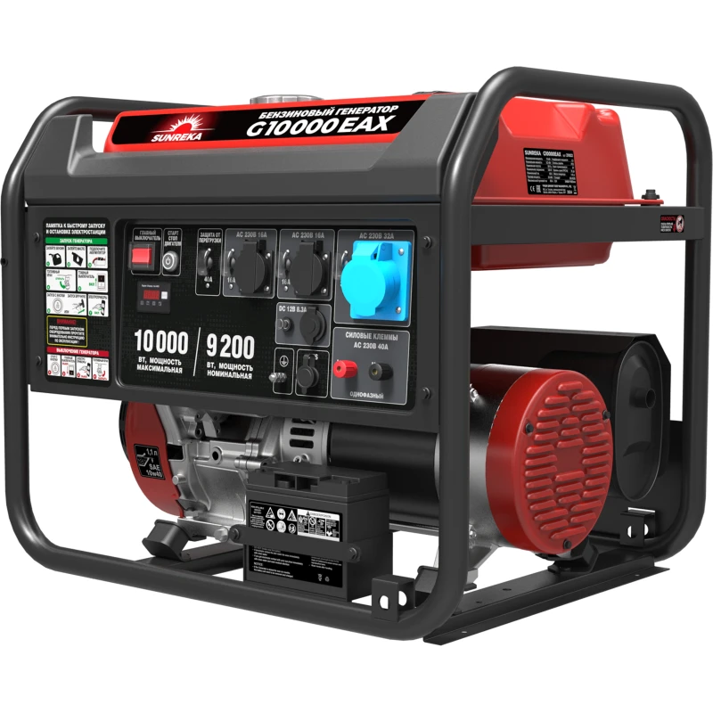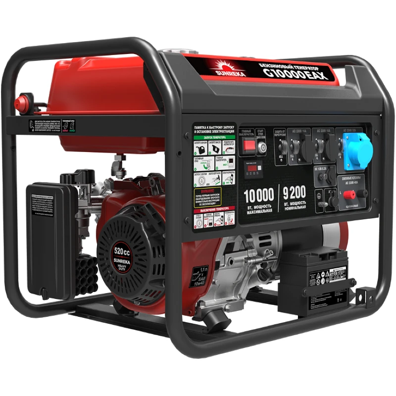 Бензиновый генератор SUNREKA G10000EAX — портативная электростанция номинальной мощностью 9,2 кВт, созданная для задач, где требуется бесперебойное электроснабжение оборудования. Особенность модели — высокая выходная мощность до 10 кВт и способность выдерживать пусковые токи до 87 А. Это открывает возможности для прямого подключения мощного профессионального инструмента: сварочных аппаратов, перфораторов, бетономешалок, глубинных насосов, а также для полного обеспечения электричеством частного дома, строительной площадки, мастерской или торговой точки. Бензиновый генератор SUNREKA оснащен 4-тактным двигателем с электростартером для максимально комфортного запуска и разъемом для подключения блока АВР. Увеличенный топливный бак на 40 литров обеспечивает до 11 часов непрерывной работы при 50% нагрузке. Передняя панель оборудована тремя розетками 230 В, в том числе силовой розеткой на 32 А, и разъемом постоянного тока 12 В/8,3 А.