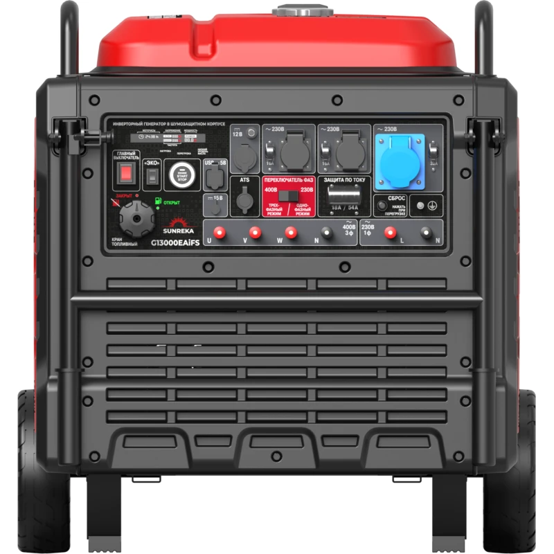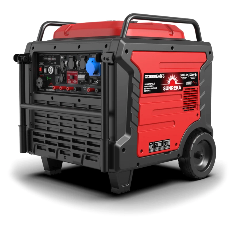 SUNREKA G13000EAiFS – самый мощный и технологичный инверторный генератор в линейке высокопроизводительных решений SUNREKA. Равномощный генератор сочетает преимущества однофазных и трёхфазных моделей: он способен выдавать 12 кВт номинальной и 13 кВт максимальной мощности как в однофазном, так и в трёхфазном режимах.
