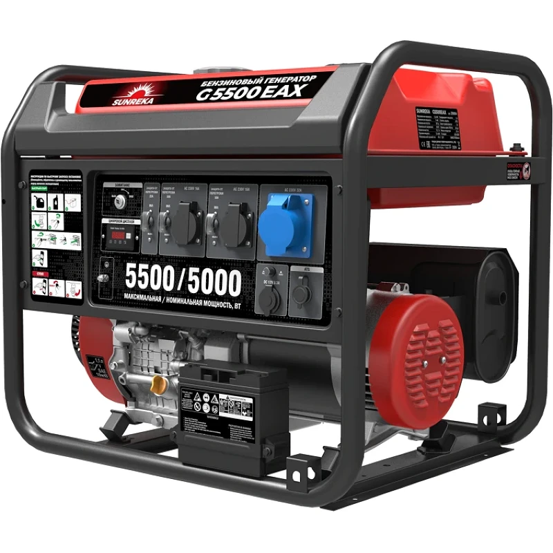 Бензиновый генератор SUNREKA G5500EAX — портативная электростанция номинальной мощностью 5 кВт, созданная для задач, где требуется бесперебойное электроснабжение оборудования. Особенность модели — высокая выходная мощность до 5,5 кВт и способность выдерживать пусковые токи до 41 А. Это открывает возможности для прямого подключения мощного профессионального инструмента: сварочных аппаратов, перфораторов, бетономешалок, глубинных насосов. Бензиновый генератор SUNREKA оснащен 4-тактным двигателем с электростартером для максимально комфортного запуска и разъемом для подключения блока АВР. Увеличенный топливный бак на 40 литров обеспечивает до 16,4 ч непрерывной работы при 50% нагрузке. Передняя панель оборудована тремя розетками 230 В, в том числе силовой розеткой на 32 А, и разъемом постоянного тока 12 В/8,3 А.