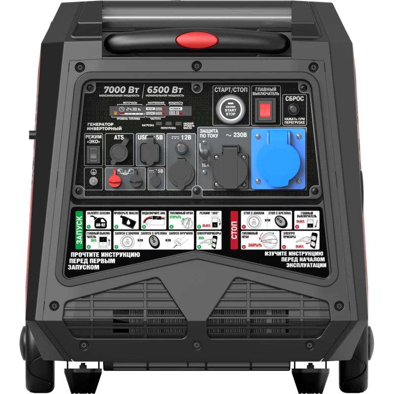 Корпус генератора оснащён двумя ручками для подъёма и переноски двумя операторами, а также колёсами и прочной алюминиевой выдвижной телескопической ручкой для транспортировки по ровному полу или асфальту. На панели генератора установлен высококонтрастный качественный LCD-дисплей, который показывает не только рабочие параметры нагрузки и моточасы, но и уровень топлива в баке.