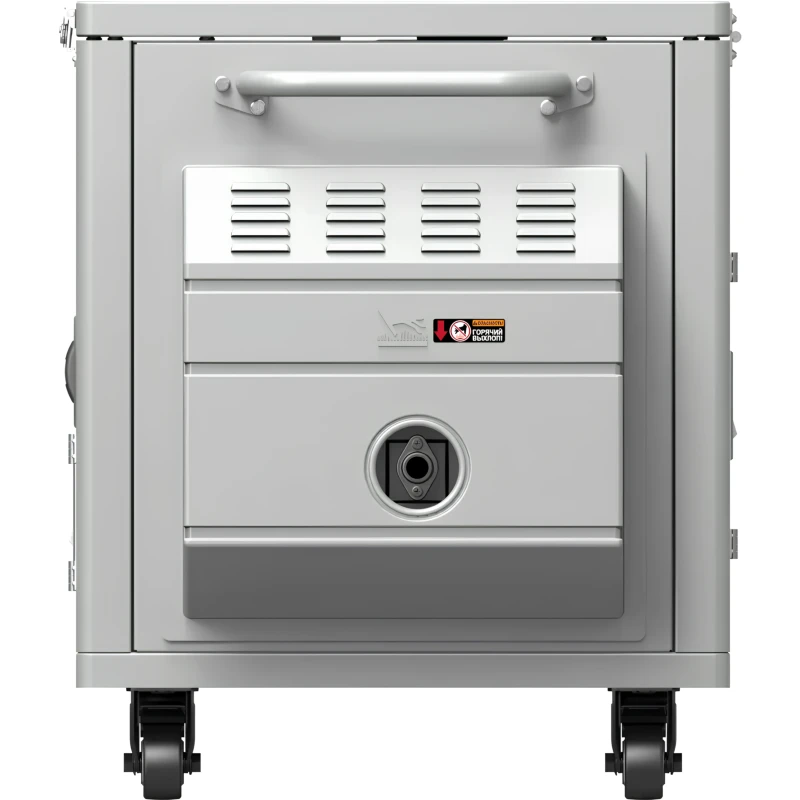 - Несмотря на вес в 94 кг и прочный корпус, генератор остается мобильным. Он установлен на колесную базу с поворотными передними колесами, оснащенными тормозом, и имеет две прочные рукоятки для подъема. Это позволяет одному человеку легко маневрировать и транспортировать установку по твердой поверхности, а тормоз обеспечивает фиксацию на склоне или неровной площадке.