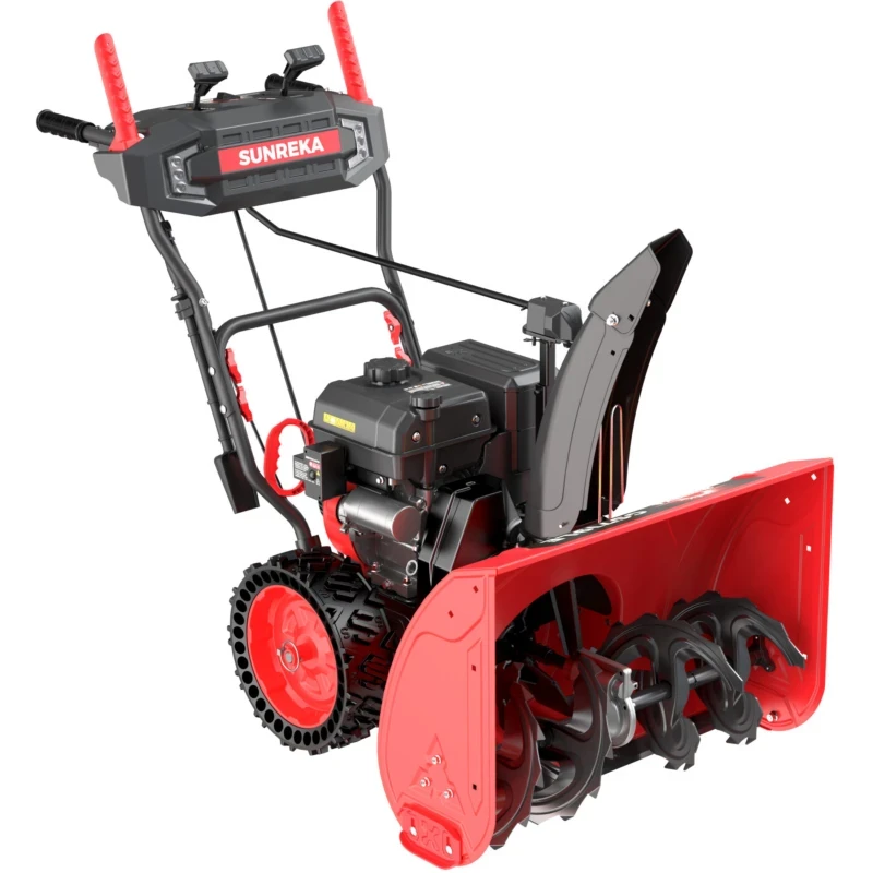 Бензиновый снегоуборщик SUNREKA оснащен зимним двигателем RATO 9 л.с., который уверенно заводится с помощью электростартера от сети 220В даже при -30C. Двухступенчатая система уборки состоит из стального шнека, который дробит снежную массу, и крыльчатки, выбрасывающей снег через поворотный желоб на расстояние до 12 метров. Оператор имеет полный контроль: шесть скоростей вперед и две назад, регулировка поворота желоба и его наклона прямо с панели управления.