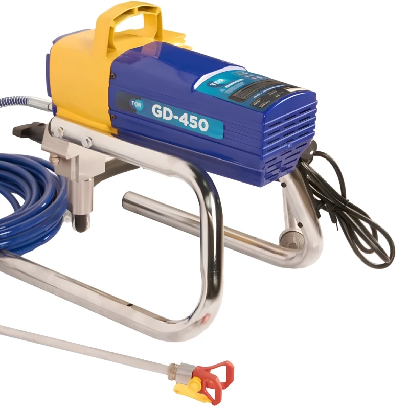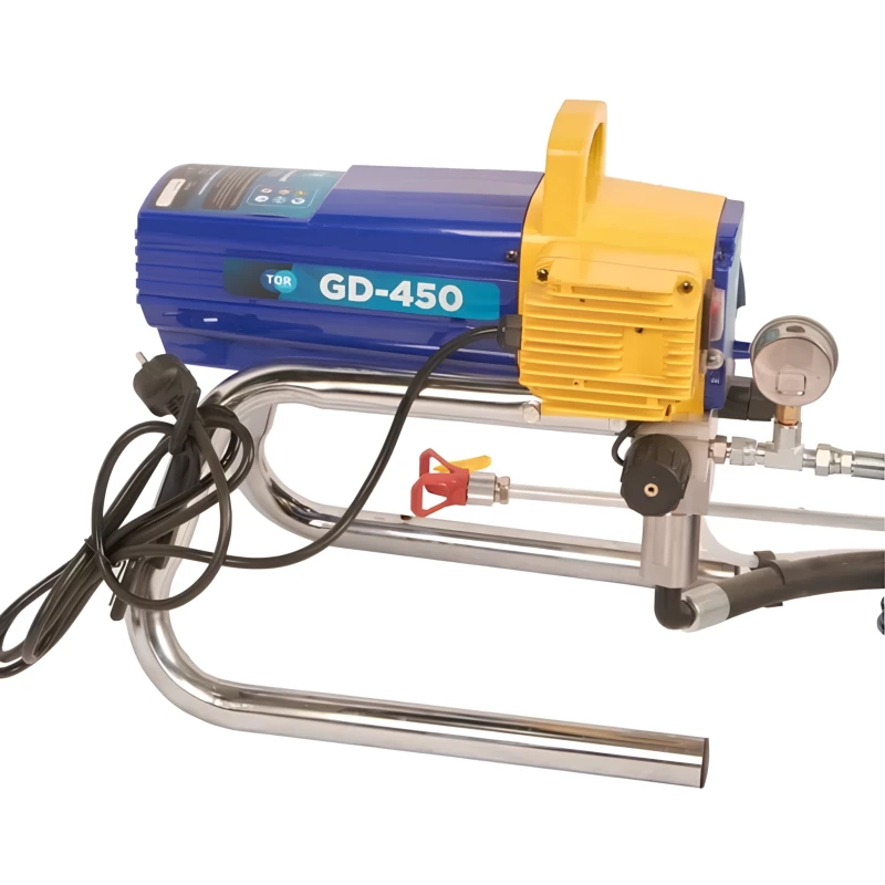 Окрасочный аппарат TOR GD-450 представляет собой компактную установку для преобразования лакокрасочных материалов в дисперсный аэрозоль. Принцип его работы основан на гидродинамическом диспергировании состава, при котором электрический привод создает необходимое давление для транспортировки и распыления жидкости. Данный процесс обеспечивает формирование однородного покрытия с контролируемой толщиной слоя. Конструкция аппарата включает поршневой насос с системой клапанов, оптимизированный для работы с составами средней вязкости. Модель демонстрирует эффективность при выполнении работ в условиях ограниченного пространства, где требуется мобильность оборудования без значительного снижения производительности.