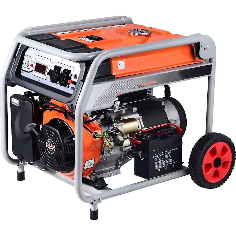 Генератор бензиновый TOR KM9500H 7,0 кВт 220В 27 л. с кнопкой запуска и колесами эта мощная модель может снабжать электроэнергией несколько потребителей одновременно либо одного, но с высокими пусковыми токами. Рекомендуется для электроснабжения дома, небольшого учреждения, офиса, магазина, производства. Вместительный бак на 27 литров бензина обеспечит беспрерывную работу на протяжении 9 часов. Синхронный альтернатор с медной намоткой позволяет вырабатывать чистый ток и выдерживать высокие нагрузки в момент запуска потребителей с электродвигателем. Кнопка запуска с электростартером облегчает процесс запуска генератора. Все рабочие механизмы прочно закреплены на массивной металлической раме. Наличие колес в комплекте помогает транспортировать генератор без особых усилий.
