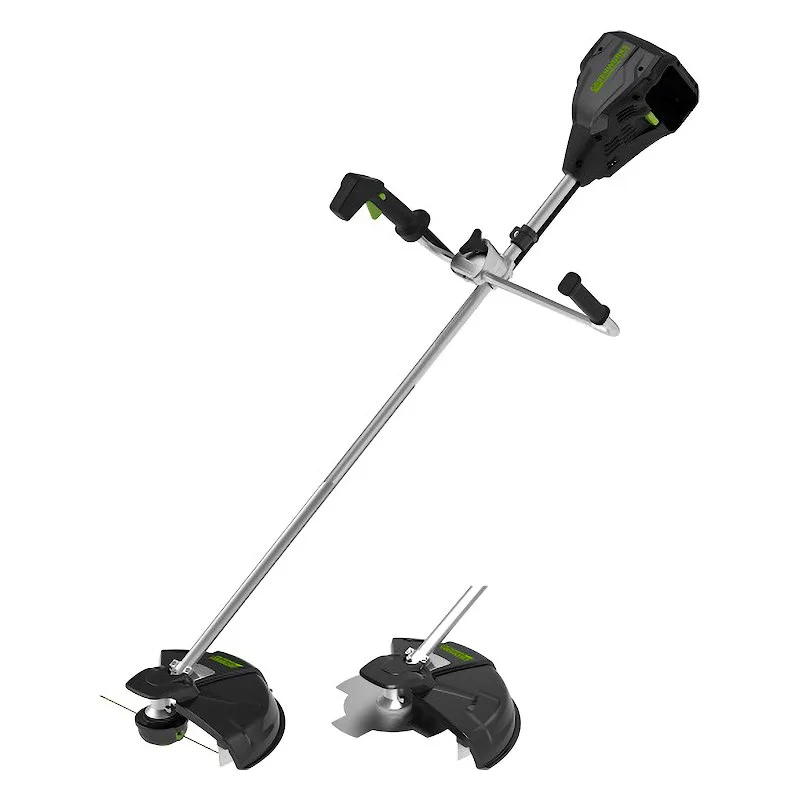 Триммер включается нажатием кнопки пуск. Время автономной работы при использовании батареи на 5 Ач составляет 1,5 часа, а в случае использования аккумуляторного ранца Гринворкс 82V на 12,5 Ач — до 3,5 часов. Триммер оснащается множеством защитных функций: защита от случайного включения, защита двигателя от перегрузок, оснащается защитным кожухом режущей части. Вал между двигателем и редуктором — прямой и сделан из специальной легкой стали. Для смазки редуктора предусмотрен специальное отверстие. Устройство входит в линейку аккумуляторного инструмента 82V Commercial и станет отличным дополнением к вашему набору устройств 82 Вольта.